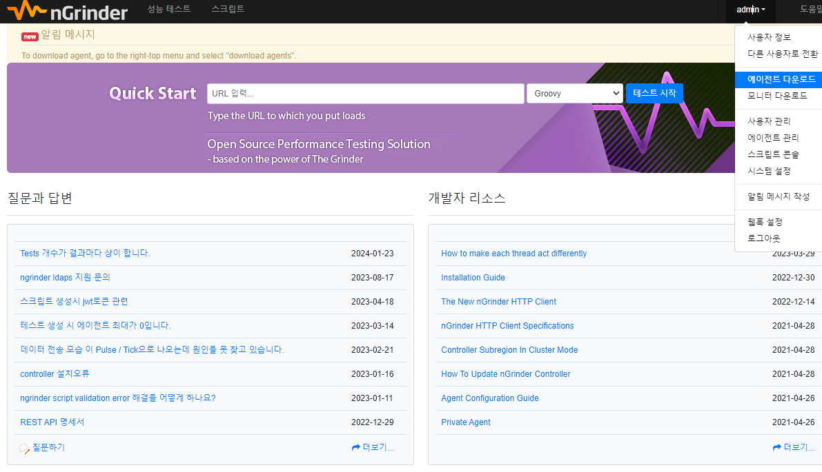6. 메뉴창에서 에이전트 다운로드를 클릭한다.